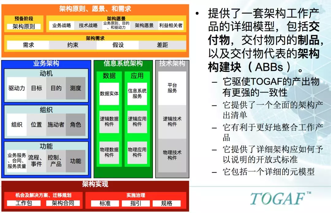 TOGAF 是 The Open Group Architecture Framework 的缩写,它由 The Open Group 开发,The Open Group 是一个非盈利的技术行业联盟,它不断更新和重申 TOGAF。