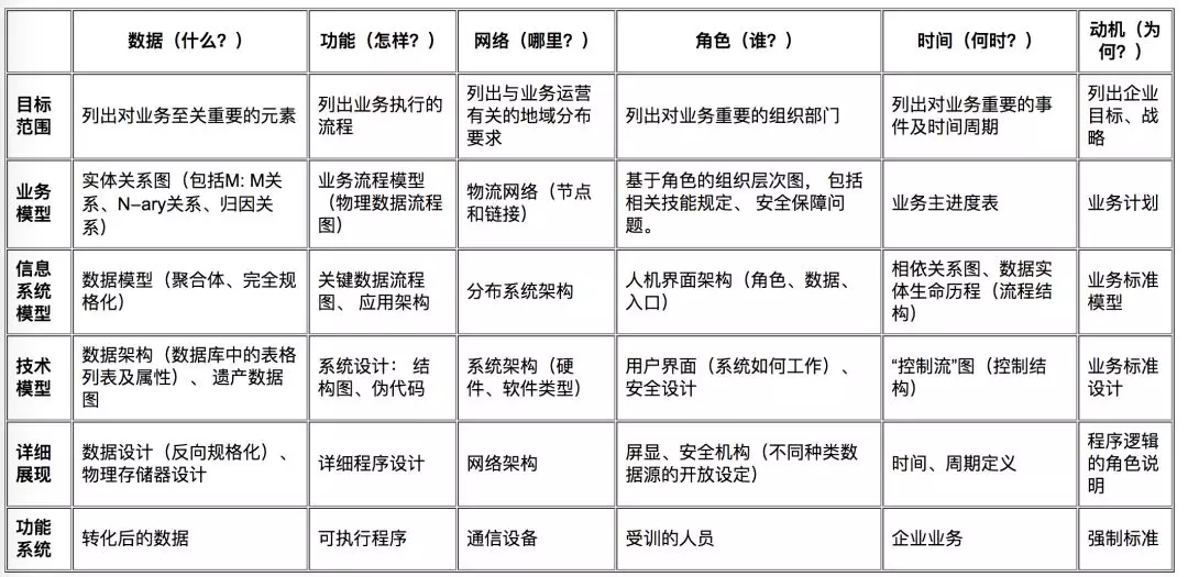Zachman 框架模型分两个维度:横向维度采用6W(what、how、where、who、when、why)进行组织,纵向维度反映了 IT 架构层次,从上到下(Top-Down),分别为范围模型、企业模型、系统模型、技术模型、详细模型、功能模型。横向结合6W,Zachman 框架分别由数据、功能、网络、人员、时间、动机分别对应回答What、How、Where、Who、When 与 Why 这六个问题。