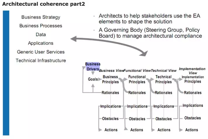 TOGAF 强调商业目标作为架构的驱动力,并提供了一个最佳实践的储藏库,其中包括 TOGAF 架构开发方法(ADM)、TOGAF 架构内容框架、TOGAF 参考模型、架构开发方法(ADM)指引和技术、企业连续统一体和 TOGAF 能力框架。