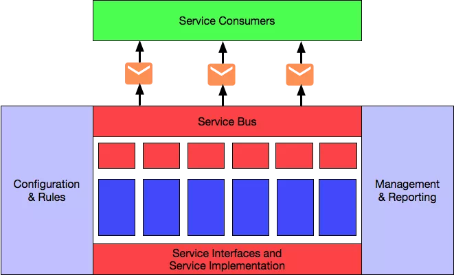 在上图中, 服务消费者(service consumer)可以通过发送消息来调用服务。这些消息由一个服务总线(service bus)转换后发送给适当的服务实现。这种服务架构可以提供一个业务规则引(business rules engine),该引擎容许业务规则被合并在一个服务里或多个服务里。这种架构也提供了一个服务管理基础(service management infrastructure),用来管理服务,类似审核,列表(billing),日志等功能。此外,该架构给企业提供了灵活的业务流程,更好地处理控制请求(regulatory requirement),例如Sarbanes Oxley(SOX),并且可以在不影响其他服务的情况下更改某项服务。