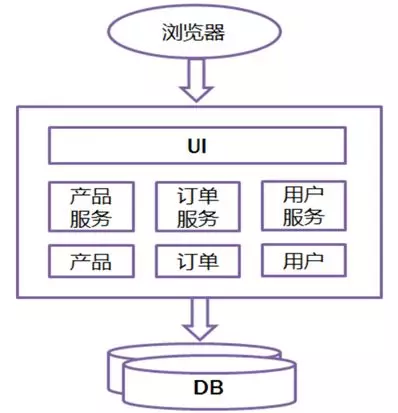 所有的功能打包在一个 WAR包里,基本没有外部依赖(除了容器),部署在一个JEE容器(Tomcat,JBoss,WebLogic)里,包含了 DO/DAO,Service,UI 等所有逻辑。