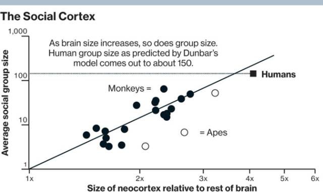 Mike 还举了一个非常有意思的理论,叫“Dunbar Number”,这是一个叫 Dunbar(废话)生物学家在 1992 年最早提出来的。最初,他发现灵长类的大脑容量和其对应的族群大小有一定关联,进而推断出人类的大脑能维系的关系的一些有趣估计。举例来说