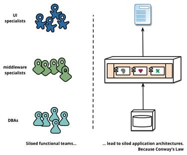 这是康威第一定律组织和设计间内在关系的一个具体应用。更直白的说,你想要什么样的系统,就搭建什么样的团队。如果你的团队分成前端团队,Java 后台开发团队,DBA 团队,运维团队,你的系统就会长成下面的样子: