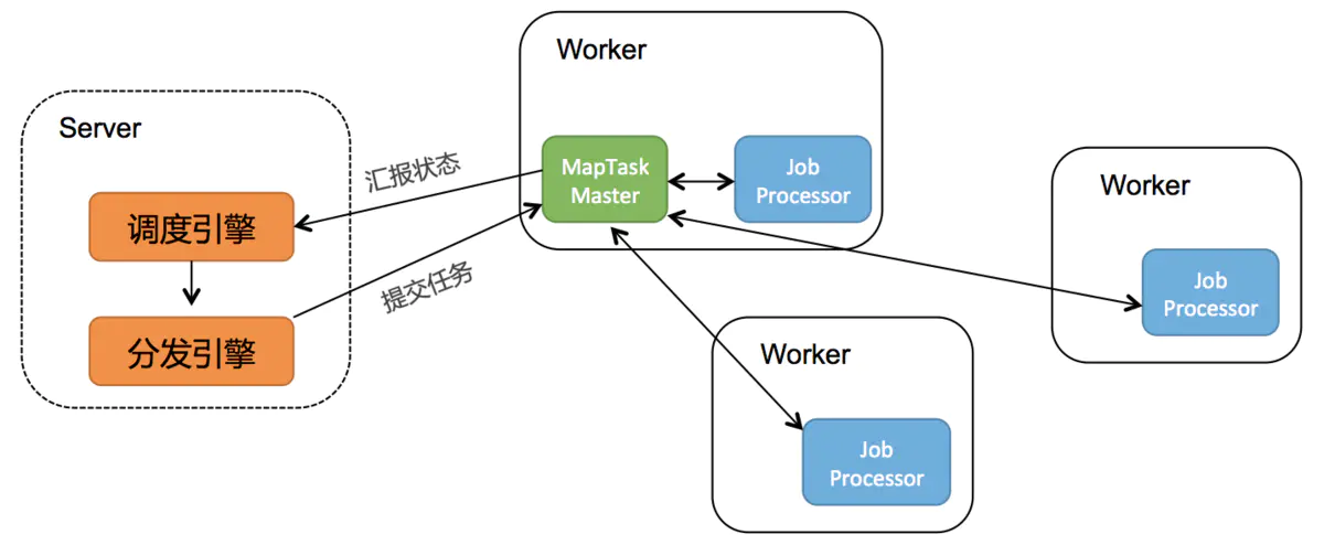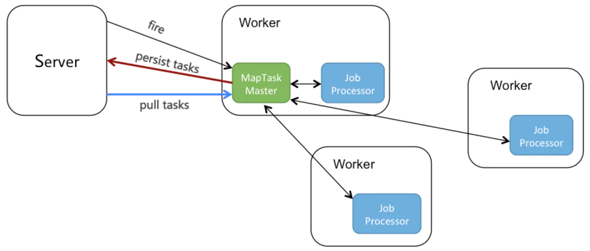 - 同时,MapTaskMaster还有个pull线程,不停拉取INIT状态的task,并派发给其他worker执行。