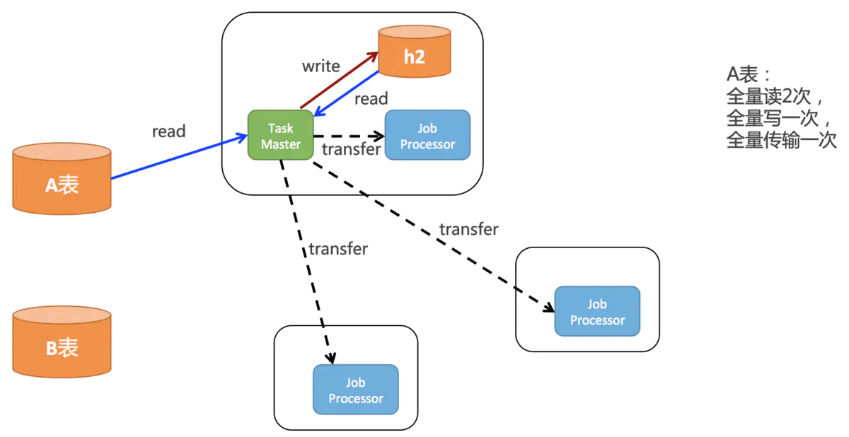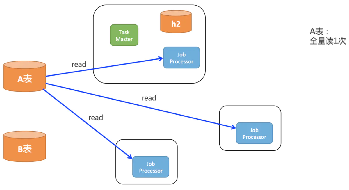 如上图所示,root任务一开始会全量的读取A表的数据,然后会全量的存到h2中,pull线程还会全量的从h2读取一次所有的task,还会分发给所有客户端。所以实际上对A表中的数据: