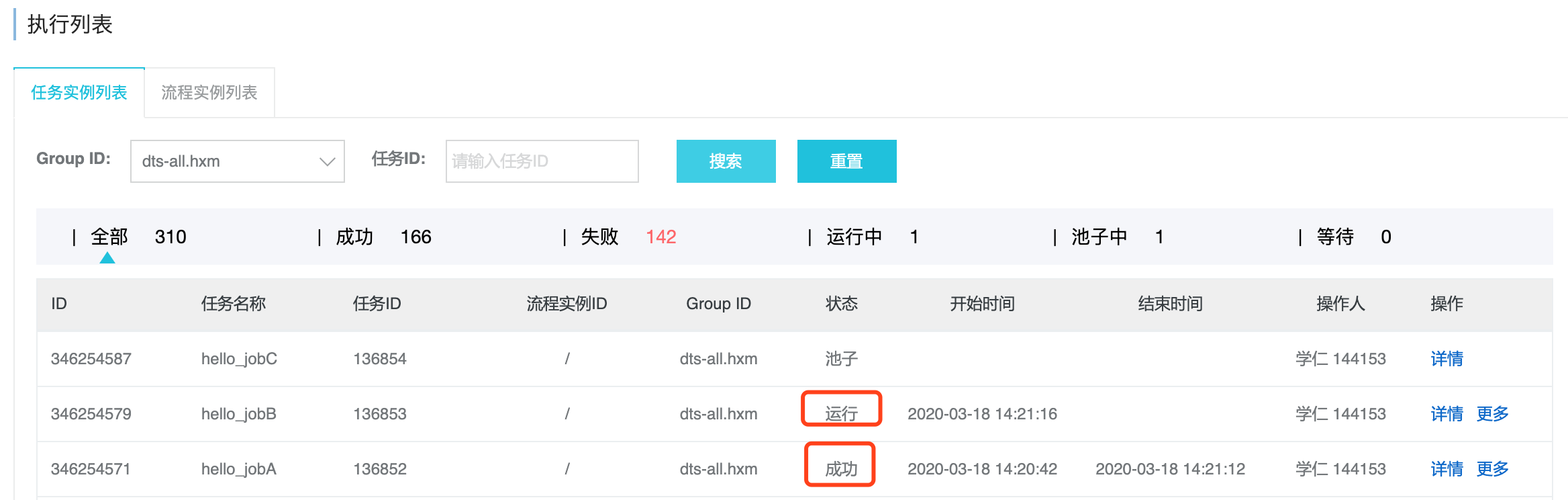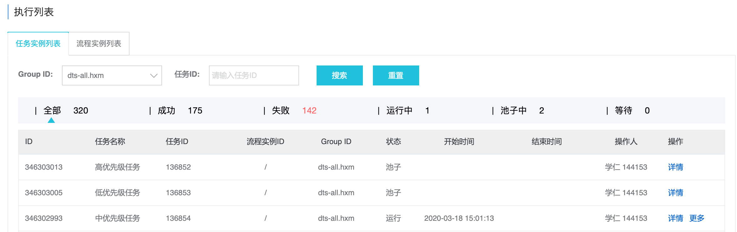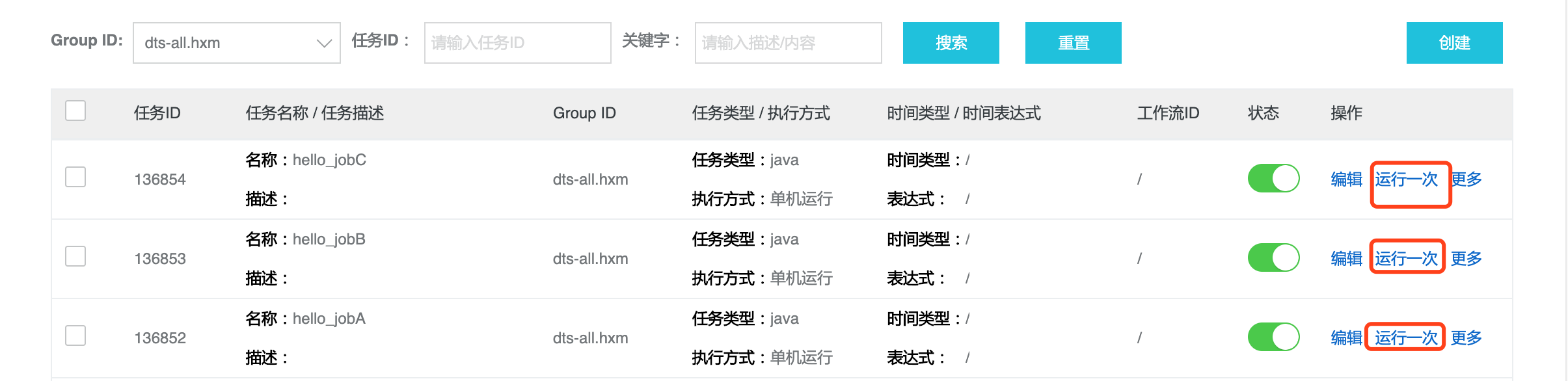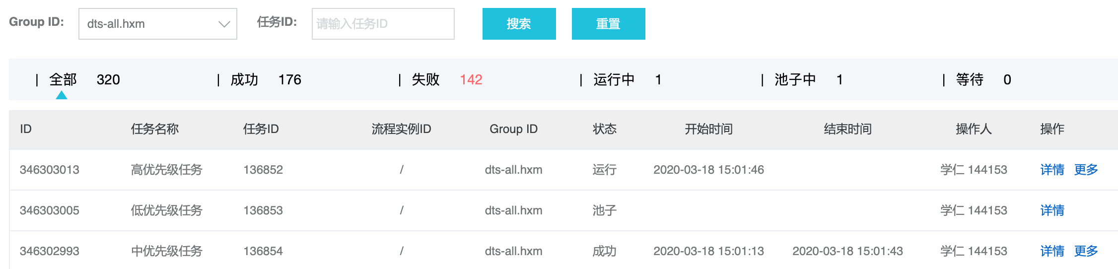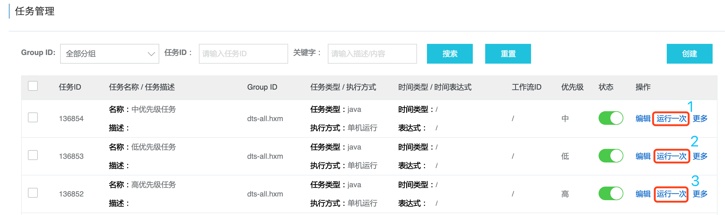 1) dts-all.hxm这个应用开启限流,队列大小=1方便观察,新建3个优先级任务如下图。先触发1次中优先级任务,再触发1次低优先级任务,再触发一次高优先级任务