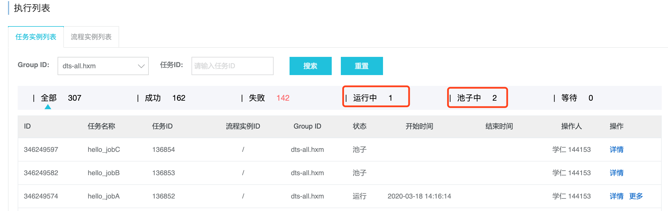 3) 会发现,第一个触发的任务hello_jobA在运行中,hello_jobB和hello_jobC在池子中排队