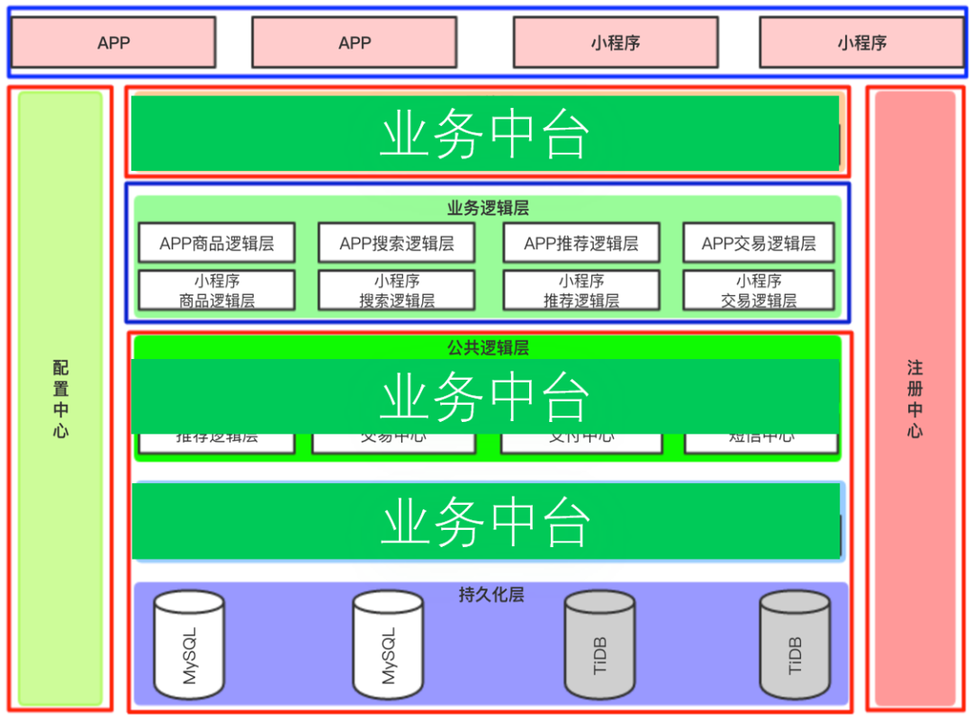 那很显然,网关是不变的;业务逻辑层是变化的,但业务逻辑层里中台的部分,是不变化的;数据访问层也是公共的;包括底层的db,不属于业务范畴,其实是一个技术的支撑,我们叫技术中台。