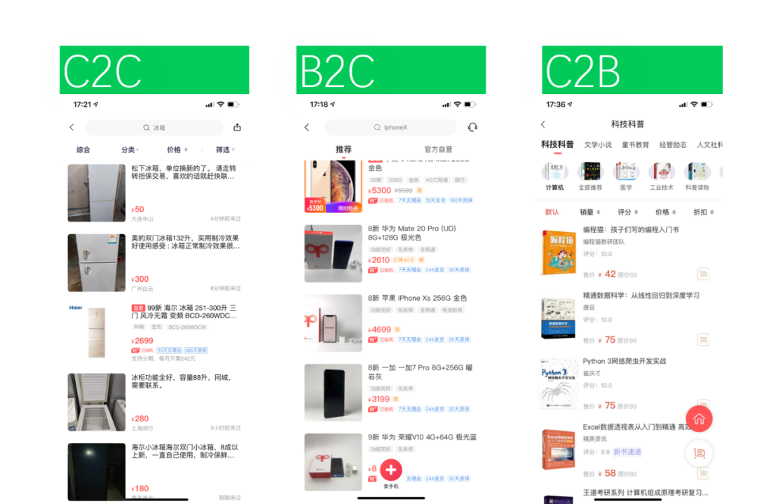 比如转转,里面有些怎样的业务呢?因为它是转卖的二手商品,所以就会有C2C(个人对个人)、B2C(商家对个人)、C2B(个人对商家)各种不同的商品模式,会有很多不同的业务。