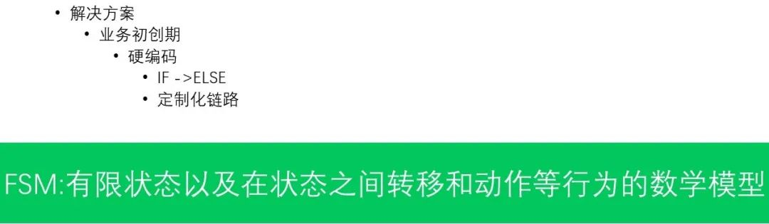 如果是在业务初创期,可以用硬编码就行,硬编码就是同一个状态它在满足不同流程里的继续往下不同的流转,你就可以if else。比如说if这个时间等于1干什么事情,else if这个时间等于2干什么事情。这时如果你的状态不复杂的情况下,这个事情做起来是比较简单的。但如果状态比较复杂的情况下用硬编码,基本上你就废了,那这种情况下怎么做呢?