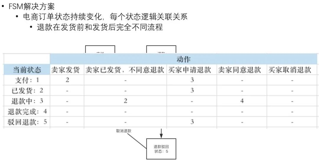 大家可以从上图看到,在很多情况下订单的整个流程是比较复杂的,电商订单的状态持续变化,每个状态的逻辑关联关系在不同的状态里变化都是不一样的。比如说退款这个操作,在发货前和发货后是完全不同的流程,发货前申请退款就会马上给予退款,但在已发货的状态下申请退款,就需要看商家是否同意,同意则退款完成,不同意则会驳回。