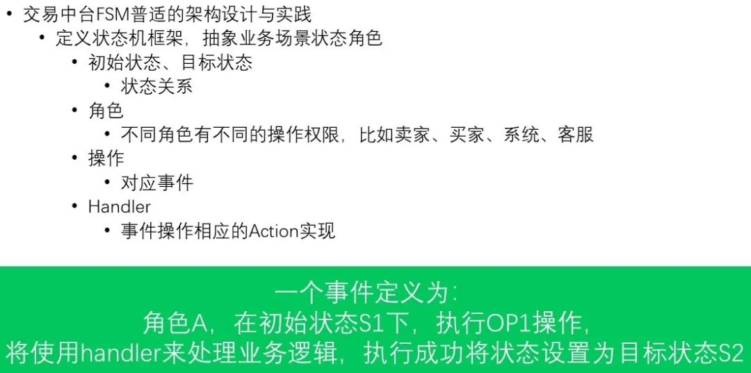 首先要定义状态机的框架,抽象业务场景状态的角色,包括初识状态、目标状态,还有角色及角色不同的操作权限,以及操作对应的事件、事件操作相应的Action实现(Handler)。需要展开说明一下的是事件的定义,就是角色A在初始状态S1下,执行OP1操作,将使用Handler来处理业务逻辑,执行成功将状态设置为目标状态S2。这些就是交易中台FSM普适的架构设计和实践。