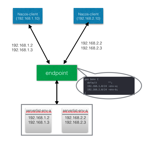 - 增强 Endpoint 的功能。在 Endpoint 端配置网段和环境的映射关系,Endpoint 在接收到客户端的请求后,根据客户端的来源 IP 所属网段,计算出该客户端的所属环境,然后找到对应环境的 IP 列表返回给客户端。如下图