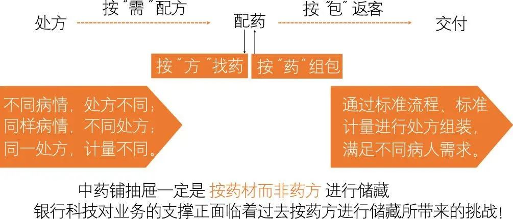 古老的中药铺对银行中台转型具有重大的启发意义,中药铺的药屉里面存放着各种各类药材,医生会根据不同的病情、不同病人的体质,按照处方通过标准流程、标准计量对药材进行组装,满足不同病人的需求。