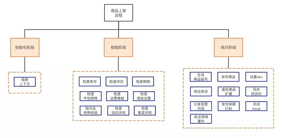 以商品上架为例,程序的入口是一个上架命令(OnSaleCommand), 它由三个阶段(Phase)组成。