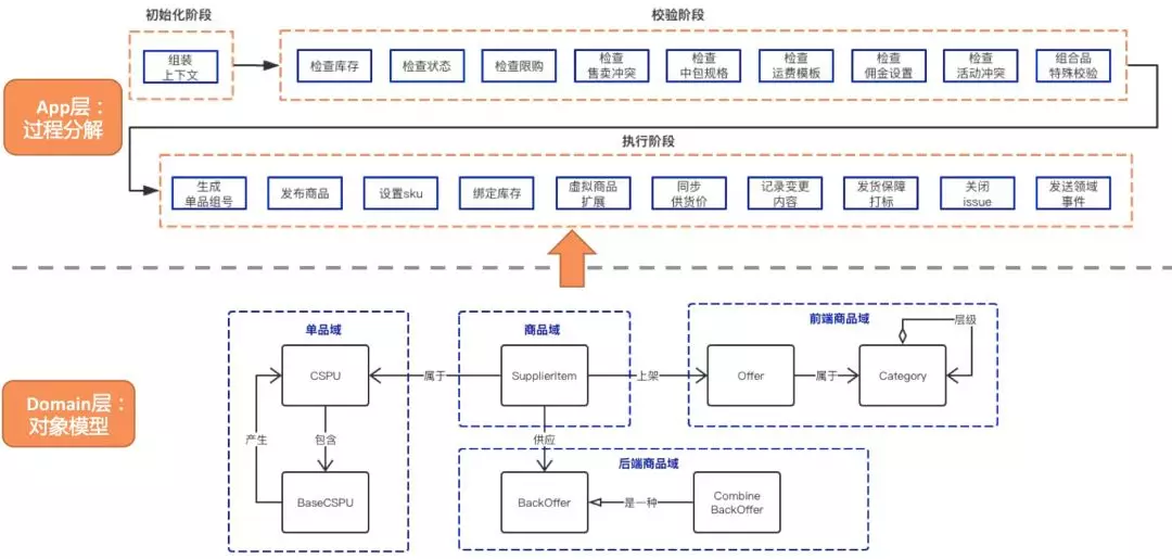 通过上面的案例,我们可以看到有过程分解要好于没有分解,过程分解+对象模型要好于仅仅是过程分解。对于商品上架这个case,如果采用过程分解+对象模型的方式,最终我们会得到一个如下的系统结构: