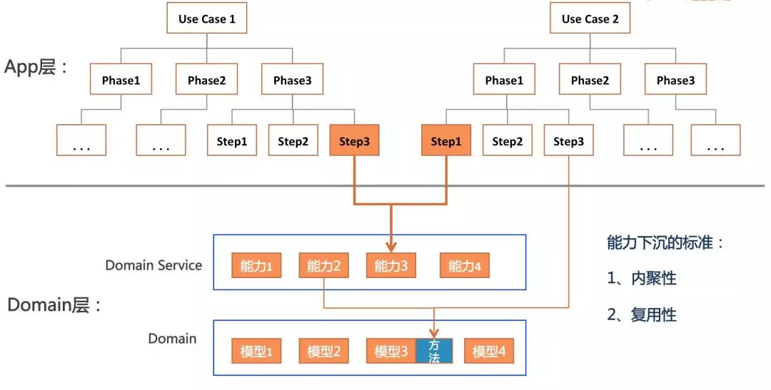 所谓的能力下沉,是指我们不强求一次就能设计出Domain的能力,也不需要强制要求把所有的业务功能都放到Domain层,而是采用实用主义的态度,即只对那些需要在多个场景中需要被复用的能力进行抽象下沉,而不需要复用的,就暂时放在App层的Use Case里就好了。
