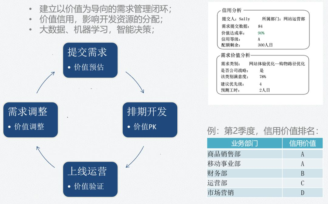 建立需求管理闭环。以价值为导向的需求治理机制,是在需求提报环节,提出该需求的价值预估,即这个需求将给业务带来什么样的价值,这些价值要能够量化、能够追踪。比如,一个结算系统需求,价值是:提升客户对账效率20%,上线后会来验证效果,看看是否达到预期。