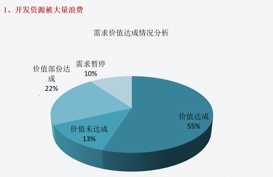 技术领导力社区,对10多家互联公司需求价值达成情况做了调研,在所有已上线的需求当中,有将近45%需求是没有达到预期的,其中23%的需求,上线后根本就没有使用过,这直接导致了开发资源被浪费,而这种浪费,通常在需求评审阶段可以避免的。