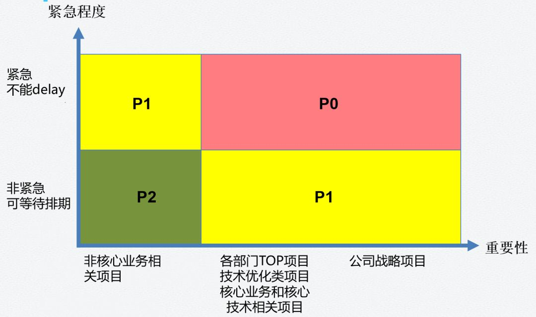 例如:公司战略项目和部门重要项目,同时又非常紧急的,这类项目是P0级项目。其它类型项目,你可以轻易的对号入座了。