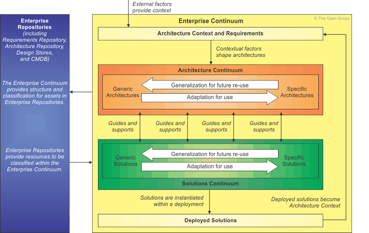 架构统一体(Architecture Continuum): 该统一体能从特定架构中提取出可复用的组件到仓库中(Reposity),为后续的类似业务的重用(Gerneralization for future re-use)。在具体应用中,可以从组件仓库中选择可复用的组件并进行与实际应用场景适配(Adaptation for use)。