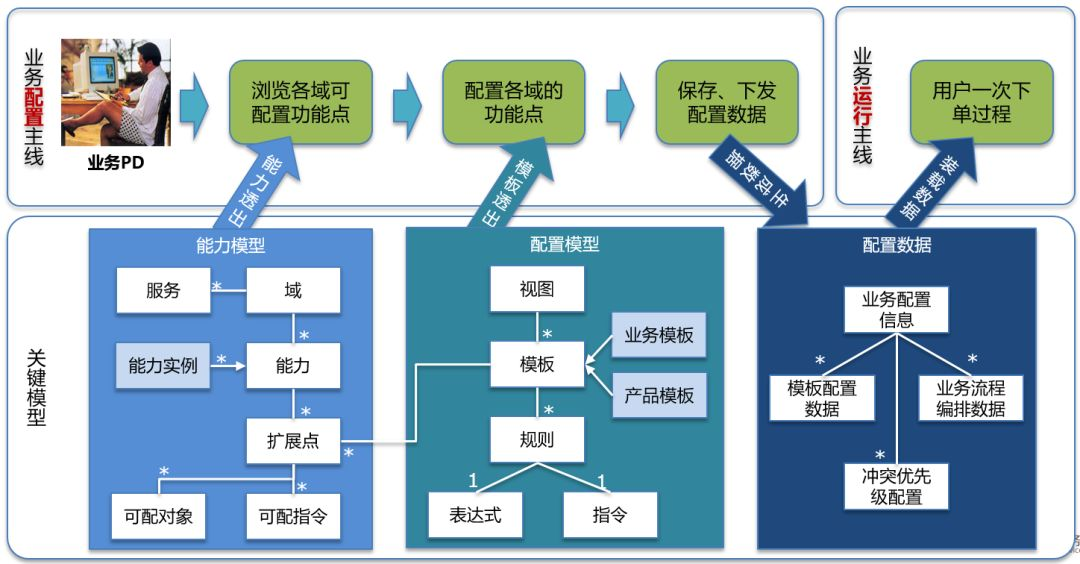 在业务配置主线中,由项目的业务PD来看一下当前业务涉及到哪些业务域,以及这些业务域下面有哪些功能和产品可以去使用,哪些业务点是可以去扩展的。这其中就需要能力域模型的支撑,通过这个模型所透出的结构化数据,来研究平台中每个域具备的能力、每个能力具有的可变点,从而有针对性地进行设置。在配置模型里,通过关键的视图模板,进行模板透出,然后保存、下发配置数据到业务运行主线。业务配置主线和业务运行主线是相交互的。