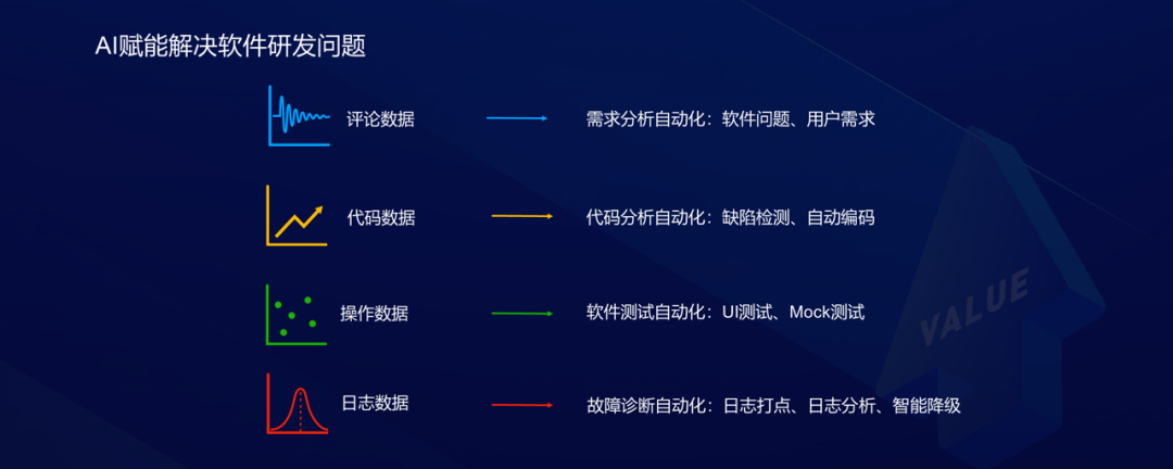 那么有了这些数据,我们可以做什么事情?基于评论数据,结合智能化手段,可以做到需求分析自动化,比如可以基于前台用户咨询的问题,结合智能化手段来帮助产品经理明确用户诉求,提炼产品文档。基于代码数据,可以实现代码分析自动化,如可以应用到代码缺陷检测和代码自动编写等领域中。基于用户的操作数据,可以做到软件测试自动化,如现在很火爆的UI测试、Mock测试等。基于日志数据,可以实现故障诊断自动化,如日志自动打点、日志智能分析以及服务智能降级等。
