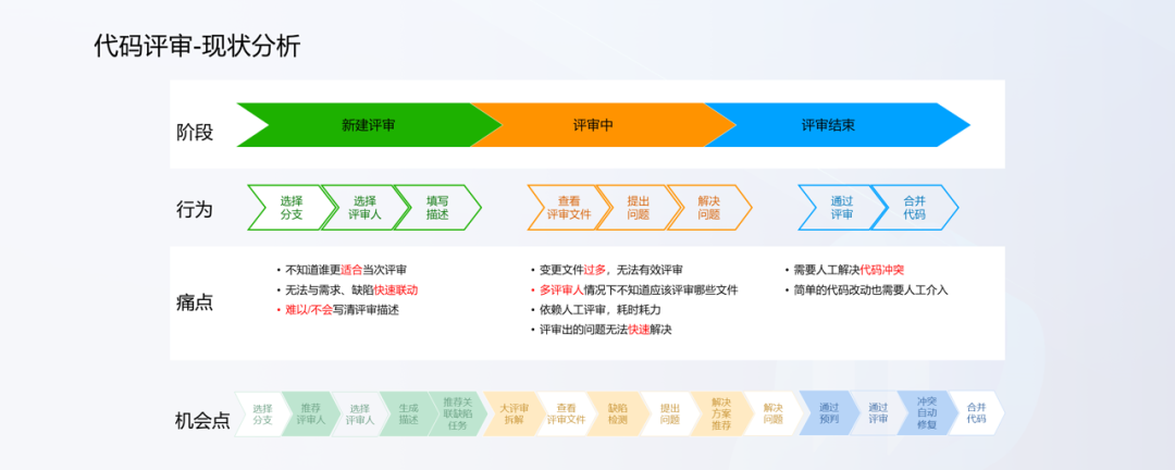 在上述过程中存在哪些痛点呢?在选择评审人环节,开发者经常不知道应该选择谁作为这段代码的评审者;在评审环节,评审者写不清评审描述;变更文件过多,无法有效评审;在评审结束环节,经常需要人工去解决代码冲突这类问题。