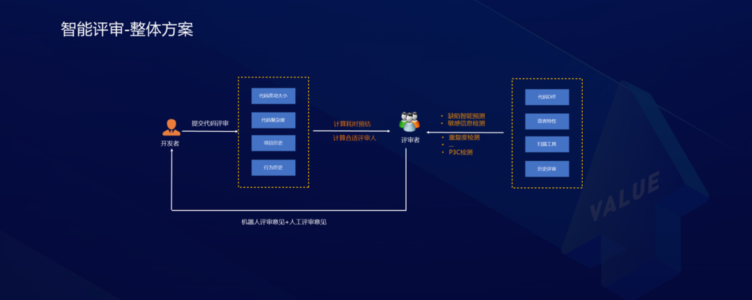 我们可以将云效智能研发助手“云豆”提供的智能化评审过程抽象为上面这张图,当一个开发者新建了一个代码评审,云豆可以结合智能化及传统自动化检测手段对这段代码进行全方位的检测,并给出一个非常综合的评审意见。此时评审者只需要在云豆提供的评审意见之上,结合自己的工作经验及对业务逻辑的理解给出补充的评审意见即可。