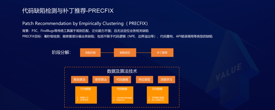 PRECFIX代码检测过程主要分为三个阶段:风险识别、缺陷定位、补丁推荐。这个过程会涉及行为数据、代码数据、日志数据的处理,以及聚类算法、推荐算法、代码建模、特征提取、深度学习等算法技术。
