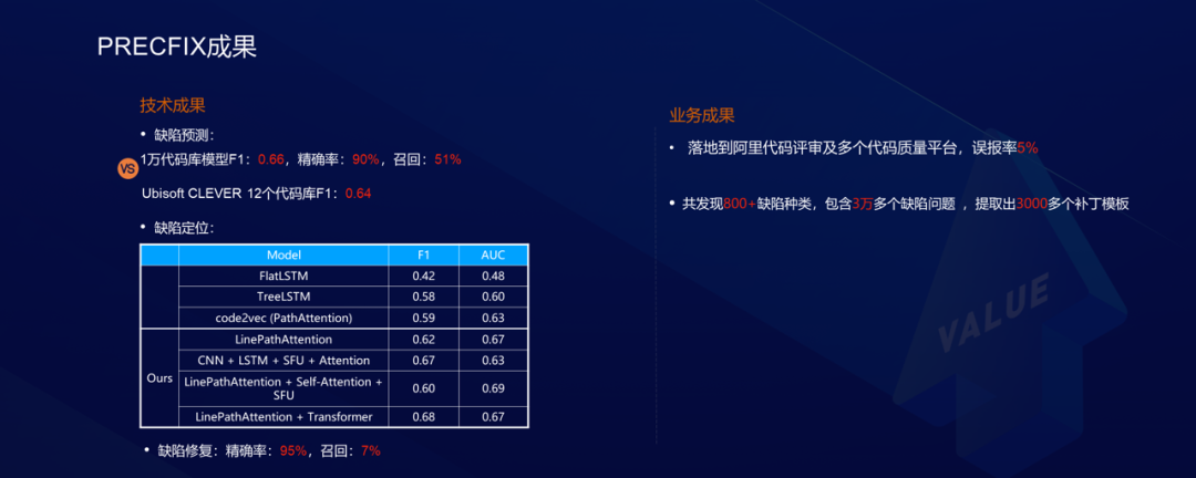 PRECFIX方法已经在阿里巴巴集团内部落地,其误报率在5%以下,在内部公开代码库中扫描出了800多种缺陷类型,3万多个缺陷,提取出了3000多个补丁模板。