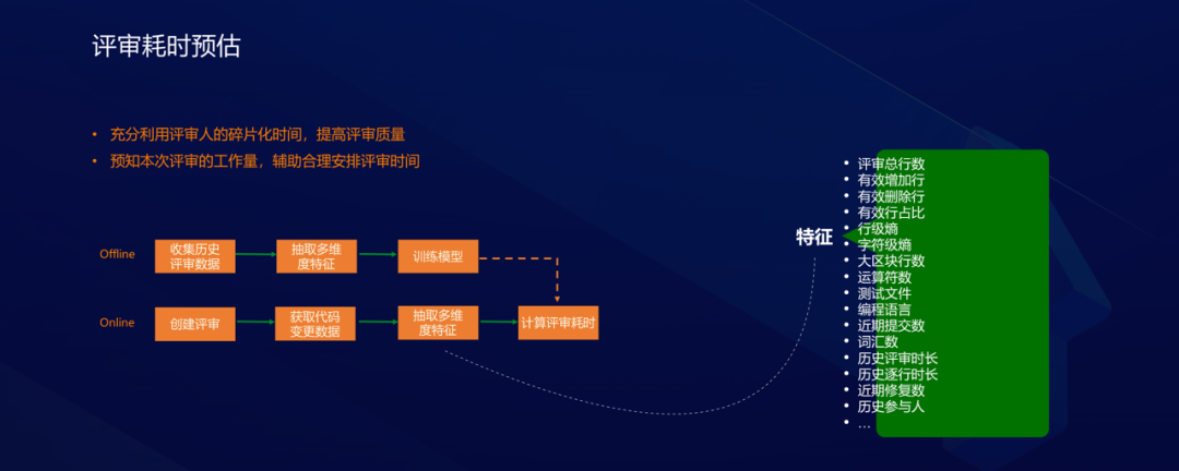 “评审耗时预估”的技术实现思路是怎样的呢?首先从几百万次的代码评审历史浏览数据中抽取特征,包括评审总行数、编程语言、历史评审时长、历史逐行时长等几十个维度的特征,从而去训练机器学习模型。当一个开发者提交了代码评审时,“云豆”会从他提交的diff文件中提取这些特征,从而估算这次评审需要的耗时。
