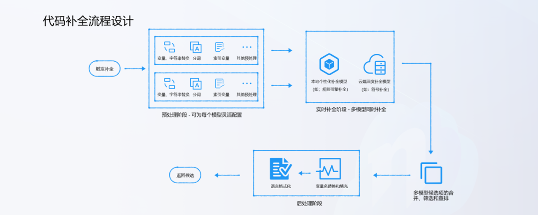 我们的代码补全流程设计如图所示,分为预处理阶段、实时补全阶段、后处理阶段。在预处理阶段,会进行变量/字符串替换、分词、索引变量等处理。在实时补全阶段,采取本地个性化补全模型和云端深度补全模型相结合的方法,然后对多模型候选项进行合并、筛选和重排。在后处理阶段,会进行变量名替换和填充、语义格式化等操作,并将最终补全候选方案推荐给开发者。