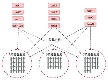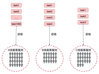 尽管预测式应急放班效果不错,但目前只针对云客服有效,对于SP类这种非选班类的客服怎么办?我们发现,线上排队时,往往是某几个技能组出现大量排队场景,比如商家线爆了,消费者线的客服可能处于空闲状态。如何解决这种忙闲不均问题?一个直观的极端想法就将所有的组变成一个大池子组,通过负载均衡分配让每一个客服都处于繁忙状态,从而达到效率最大化。而事实上并不是所有的技能组之间都能互相承接,这里既要权衡业务,又要线下培训让客服具备多技能。