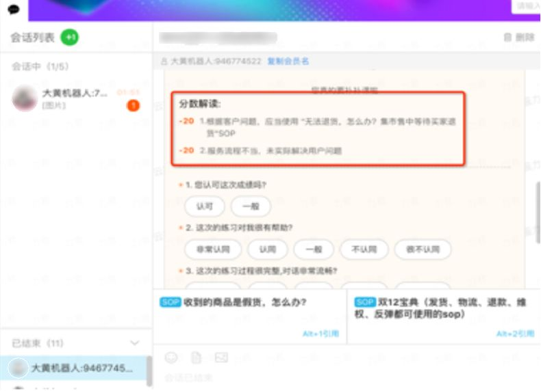 我们创新的提出了使用机器人(大黄)来培训客服这一全新的客服培训模式(已申请专利)。新客服在培训租户里,通过点击大黄头像,会产生一通非常真实的模拟会话,通过和会员聊天,不断学习平台工具使用,不断提升解决客户问题能力。一旦会话结束后,大黄机器人会对这通会话进行评价,并会告知应该使用某种具体的解决方案来回答用户问题。