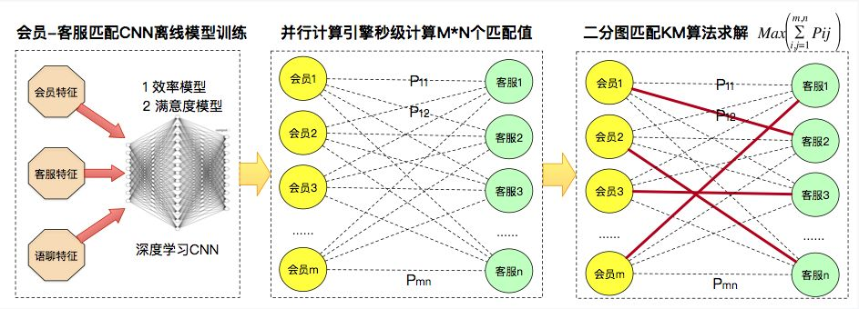 如何求得任务与客服之间的匹配概率?抽象为分类回归问题,核心在于构建大量样本(x1,x2,x3,…,xn)(y)。针对一通历史会话任务,y是客户评分或会话时长(目标可选),而x既包含了客服特征如过去30天的满意度、平均响应时间等等离线指标,以及客服当前会话的服务会员数、最大会员数等实时指标,也包含了任务的特征,如问题类型、等待时间、订单编号、重复咨询次数等等。样本有了后,下面就是选择分类算法进行训练,最终我们采用了CNN。