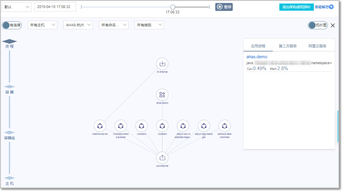 首先要实现架构可视化。服务器、存储、网络是现代云平台的基础设施。随着上云战略的推进,越来越多的企业将业务、服务、系统构建在云平台上。利用阿里AHAS的架构感知可以全面了解云上系统架构,以可视化的方式直观呈现云资源、容器和应用间分层依赖关系。