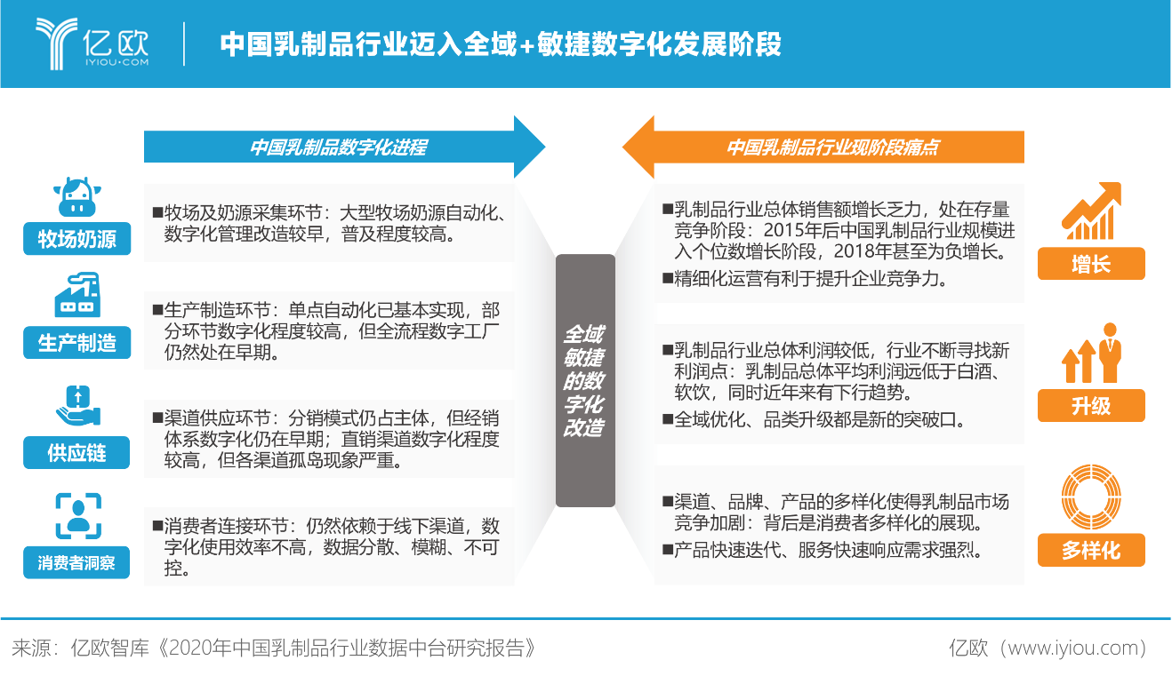 《报告》认为,未来,中国乳制品行业中国乳制品行业迈入全域+敏捷数字化发展阶段,基于单点的数字化已无法满足行业的需求,全流程、可快速响应的数字化改造将成为中国乳制品新的数字化解决方案。