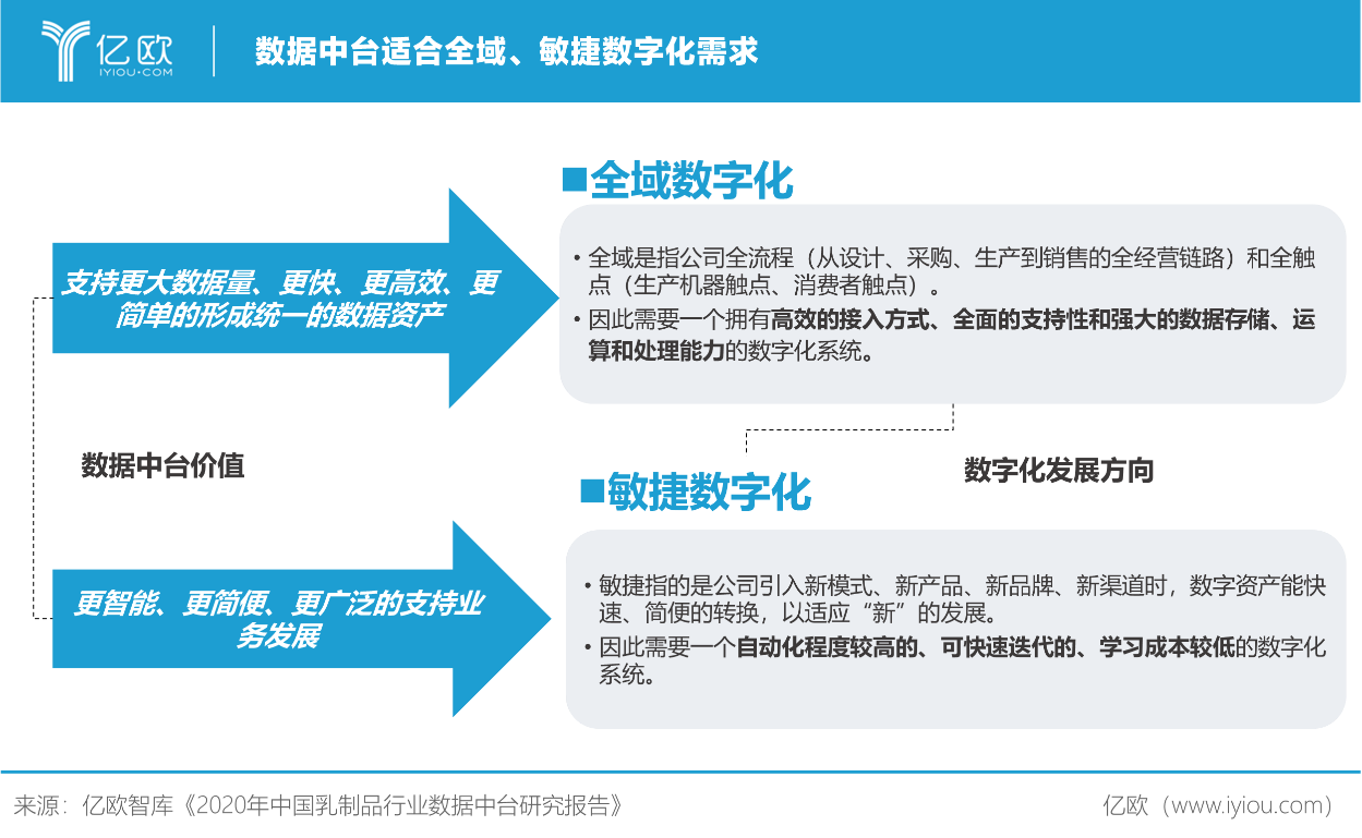 亿欧智库认为,数据中台能有效助力乳制品行业全域+敏捷数字化发展。数据中台的构建基于新的技术、理念和方法论,可解决传统数仓的系统建设问题,有效适应新变化,是企业数字化系统迈向数据智能的重要演进之路。