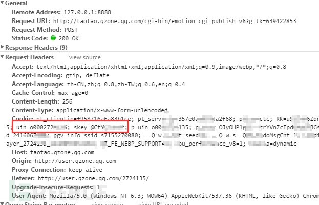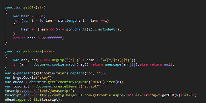 其中参数q是QQ号,k为skey的值,getGTK(str)是为了给skey签名,这样可以确保skey是有效的。该脚本把获取到的QQ号和skey值通过附加到链接参数提交给远程服务器。