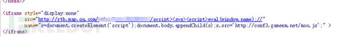 用于绕过浏览器的XSS过滤器,浏览器会将这三个标签忽略掉只留下后边的内容,然后第一个注释符号将后边的内容都给注释掉了,最后的有效内容就一句:eval(window.name)。之后eval会将字符串name里边的内容当作js代码执行,其执行结果就是在文档结尾创建<script></script>标签去加载执行js主功能模块http://conf3.gamexm.net/moo.js。主功能js部分代码如下所示: