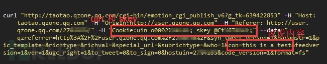 然后我使用curl命令通过发表说说的api向服务器发送一个包,包内容如下: