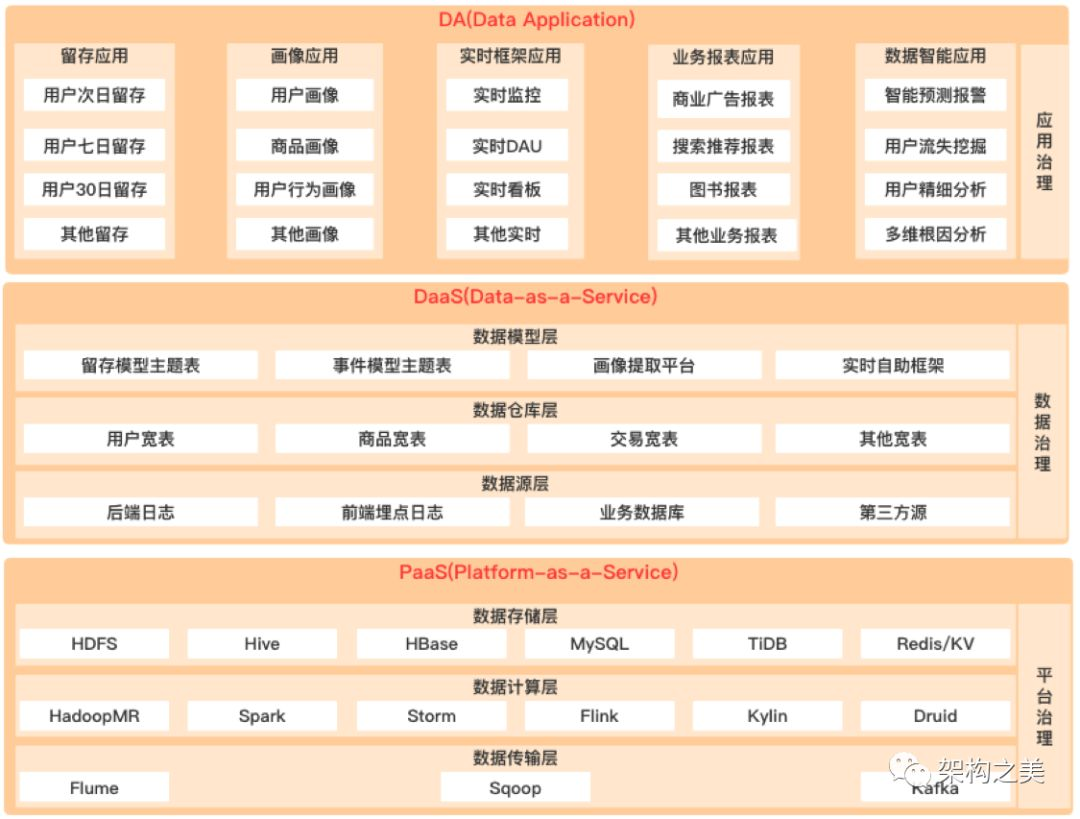 假如公司的数据架构采用了目前主流的Hadoop生态架构模式(如图5),其中大中台部分包括:PAAS层(数据传输、数据计算、数据存储)、DAAS层(数据源、数据仓库、数据集市 /数据模型),小前台部分包括:DA(Data Application)(留存应用、画像应用、业务报表应用、数据智能应用)。