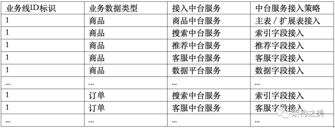 公司统一了业务线三级体系结构后,需要提供统一的业务注册中心,使得业务通过业务注册中心完成所有业务线三级体系结构的注册以及查询。其次公司层面需要统一的业务线分发配置服务,分发配置服务的作用是把每个小前台业务需要连接的中台服务集中配置(比如手机前台业务需要接入商品中台、搜索中台、客服中台、交易中台等配置策略),并且配置小前台业务数据分发到每个中台服务的具体的接入策略(比如手机前台业务接入到搜索服务中台,手机业务哪些字段需要建立索引等接入策略),详见表2所示: