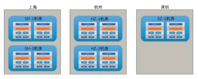 灾难发生可能性相对更小。这种灾难发生的原因一般是机房电线网线被挖断,或者机房维护人员操作失误导致的。在这种情况下,就需要人工的制定流量挑拨(切流)方案了。下面我们举例说明这个过程,如下图所示为上海的两个IDC机房。