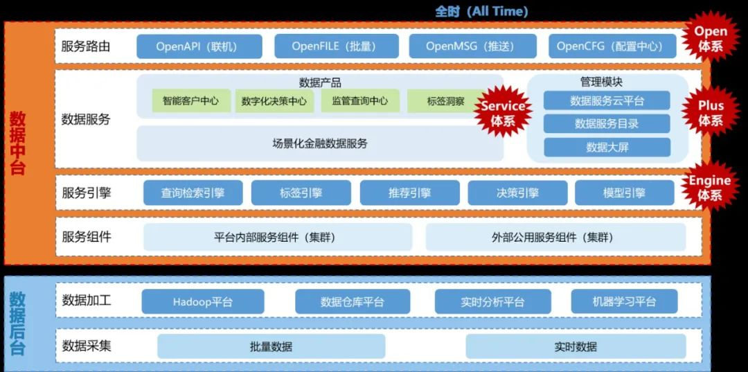 民生银行数据中台体系采用“微服务+云化技术”作为基础技术架构选型,核心运转模式由 Engine 引擎体系、 Service 服务体系、 Open 路由体系、 Plus 管理体系各类专项组件协同运转完成: