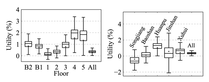 同时我们还发现,aBeacon系统在不同楼层和不同的地区体现出较大的差异性。如图3所示,部署在B2层和4/5层的设备可以带来更大的效用,这其实也印证了我们前面的分析,骑手在这些楼层商户的准确到店时间更难观测,通过部署aBeacon设备,我们可以在这些商户取得更大的效用。