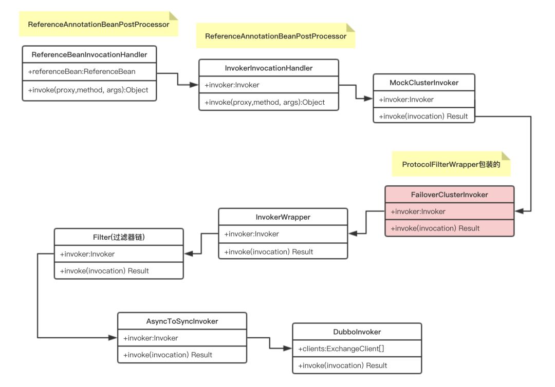 图为服务引入过程中,DubboInvoker被包装的次数及顺序。由于默认使用的集群容错策略为Failover,因此DubboInvoker还会被FailoverClusterInvoker包装,实现调用失败重试。