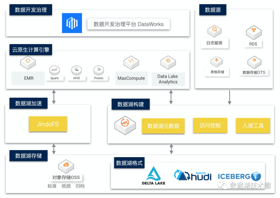 数据湖存储用云上的对象存储OSS加上 JindoFS 取代HDFS,提升数据规模、降低存储成本、实现计算和存储分离架构;