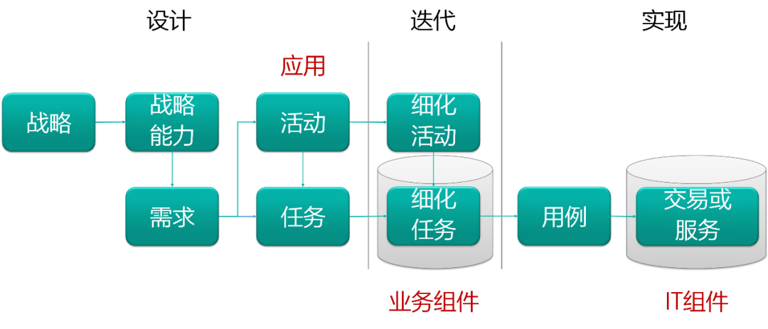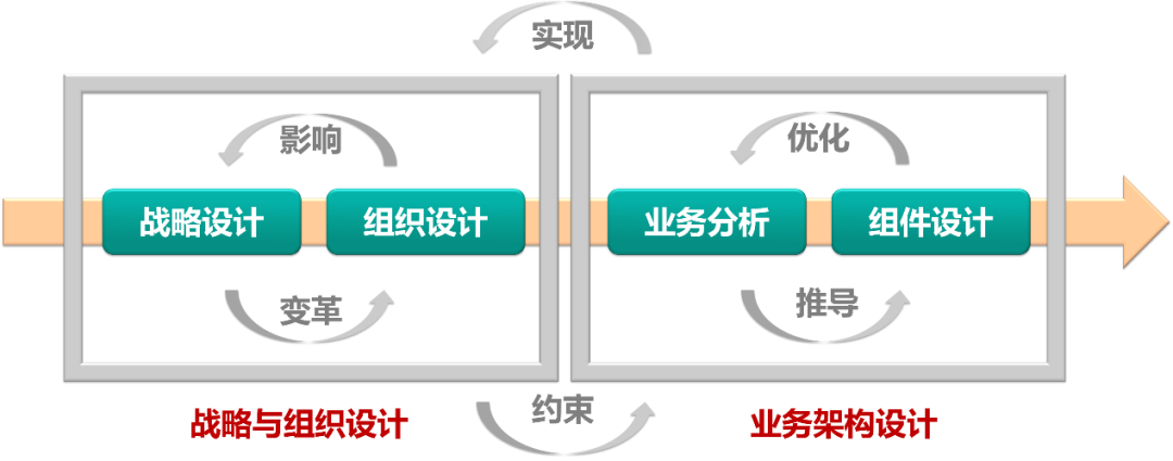 战略和组织确定后,就进入技术层面的业务架构设计。通过业务分析来推导业务能力,并将业务能力聚类成业务组件。业务组件可以被理解成一个“筐”,里面放的就是各种能力零件,把这些能力串接起来就成为业务过程。串接的顺还是不顺,也会检验我们原来的流程设计是不是合理,两者之间可以有一个互相验证,所以业务分析可以推导组件设计,组件设计也可以反过来可以优化业务分析。